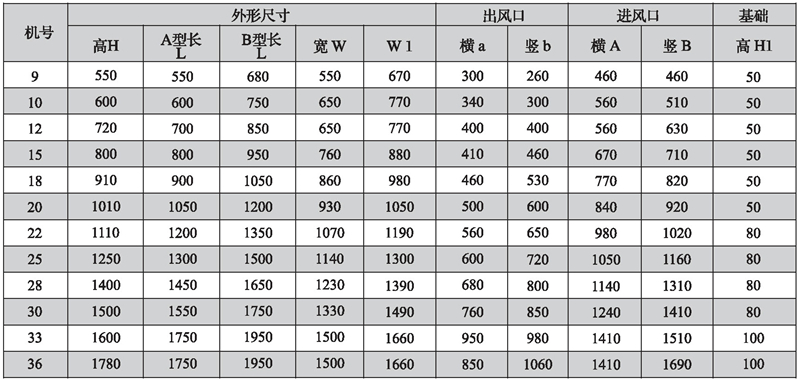 2.機號NO為葉輪直徑英寸數(shù),如電機放在風(fēng)機上面,A型高度須補加電機高度,寬度須補加皮帶罩寬度;如電機放在風(fēng)機側(cè)面,A型寬度須補加電機長度。